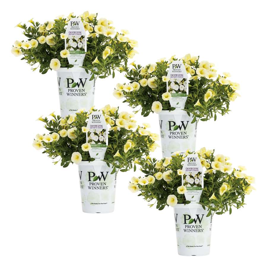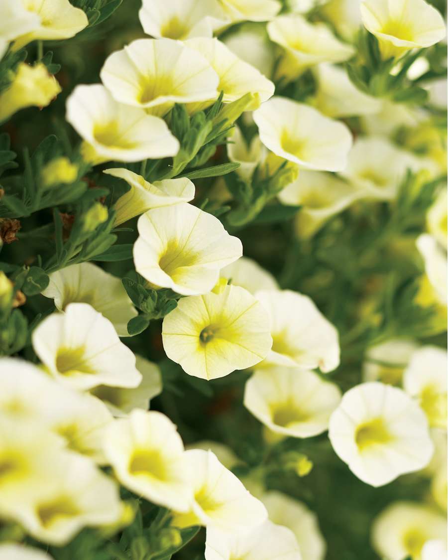 SPRING FLOWER: This beautiful Superbells Yellow Chiffon calibrachoa is a light and creamy yellow with bright green veins and a darker green center. They thrive in containers or raised beds!