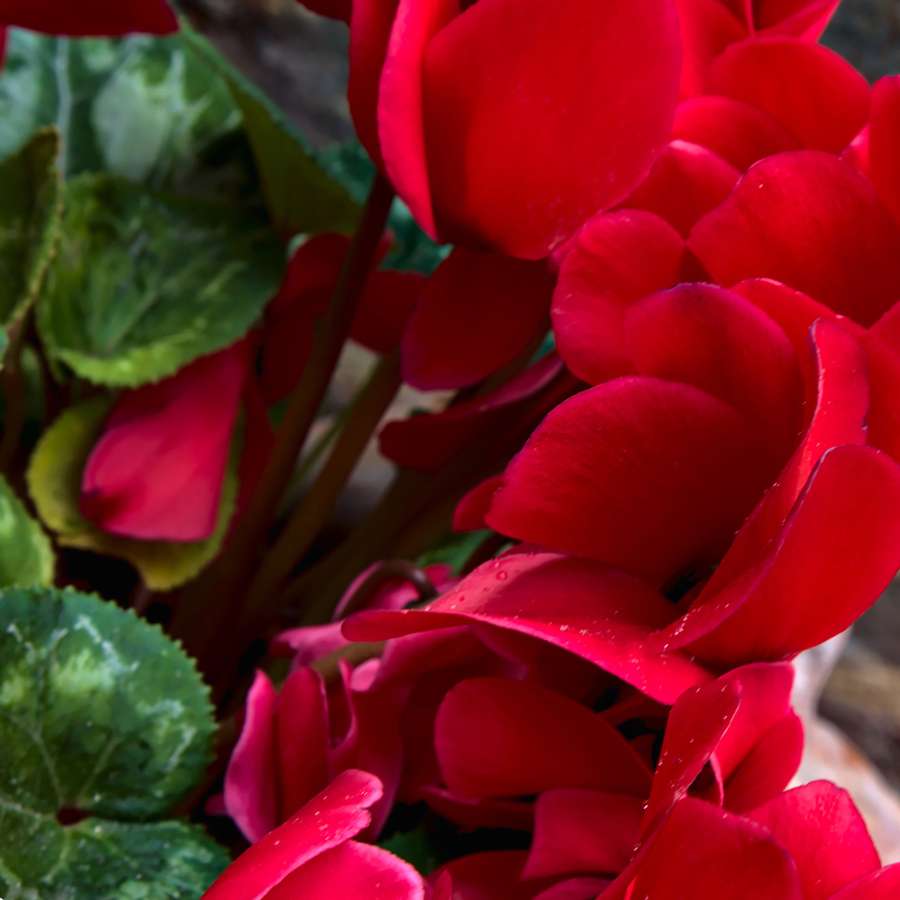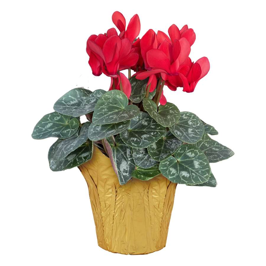 CARE: Cyclamen prefer a location with bright, indirect sunlight and well-draining soil. Water regularly directly into the soil instead of over the leaves to avoid rotting. Fertilize about once a month during the growing season.