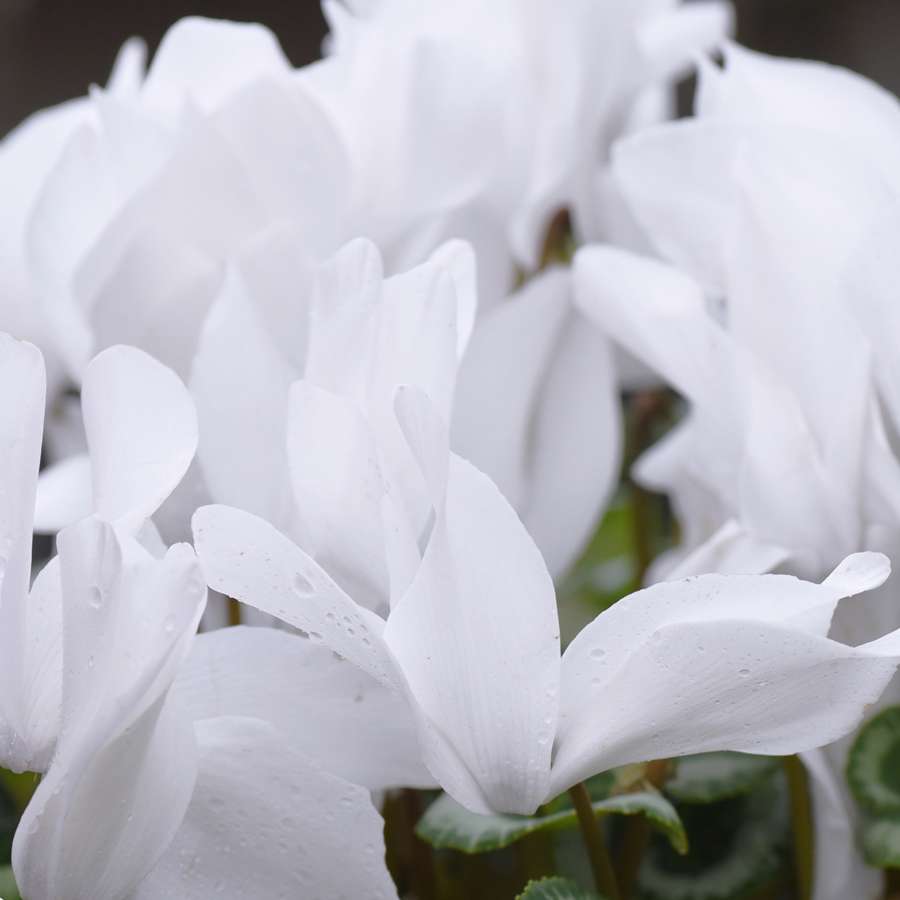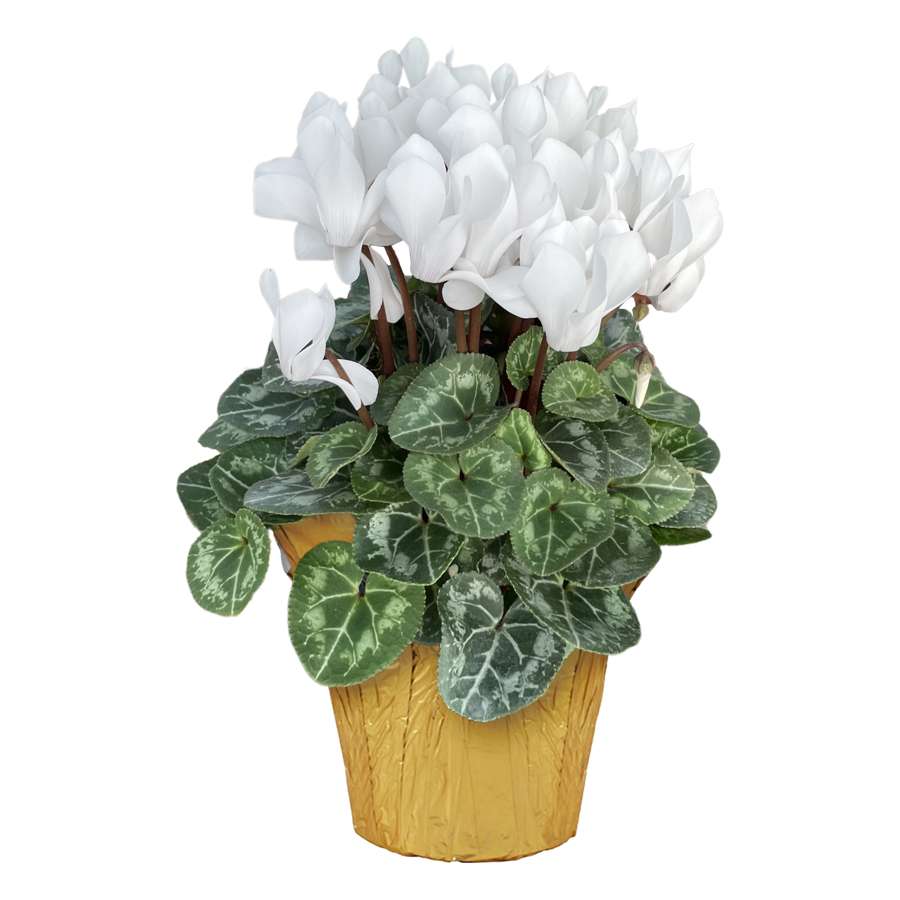 CARE: Cyclamen prefer a location with bright, indirect sunlight and well-draining soil. Water regularly directly into the soil instead of over the leaves to avoid rotting. Fertilize about once a month during the growing season.