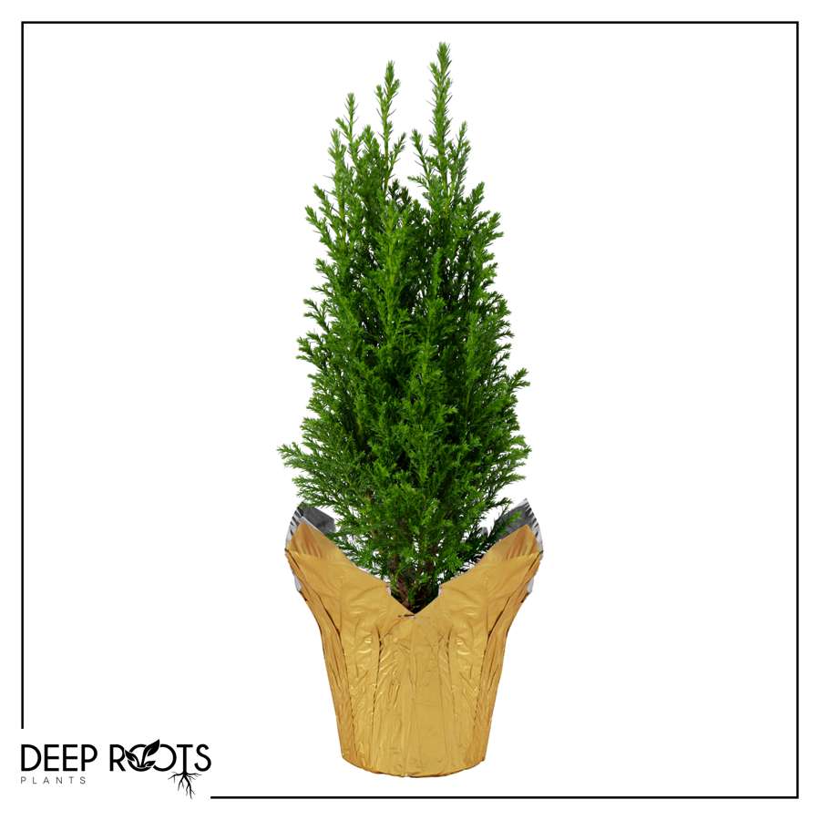 This dark green cypress tree will make the perfect addition to your space. It's cone-like shape and dark green color stand out and complement its surrounding plants. Keep in a pot for porch décor or plant in your yard for a privacy tree!