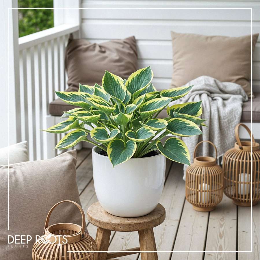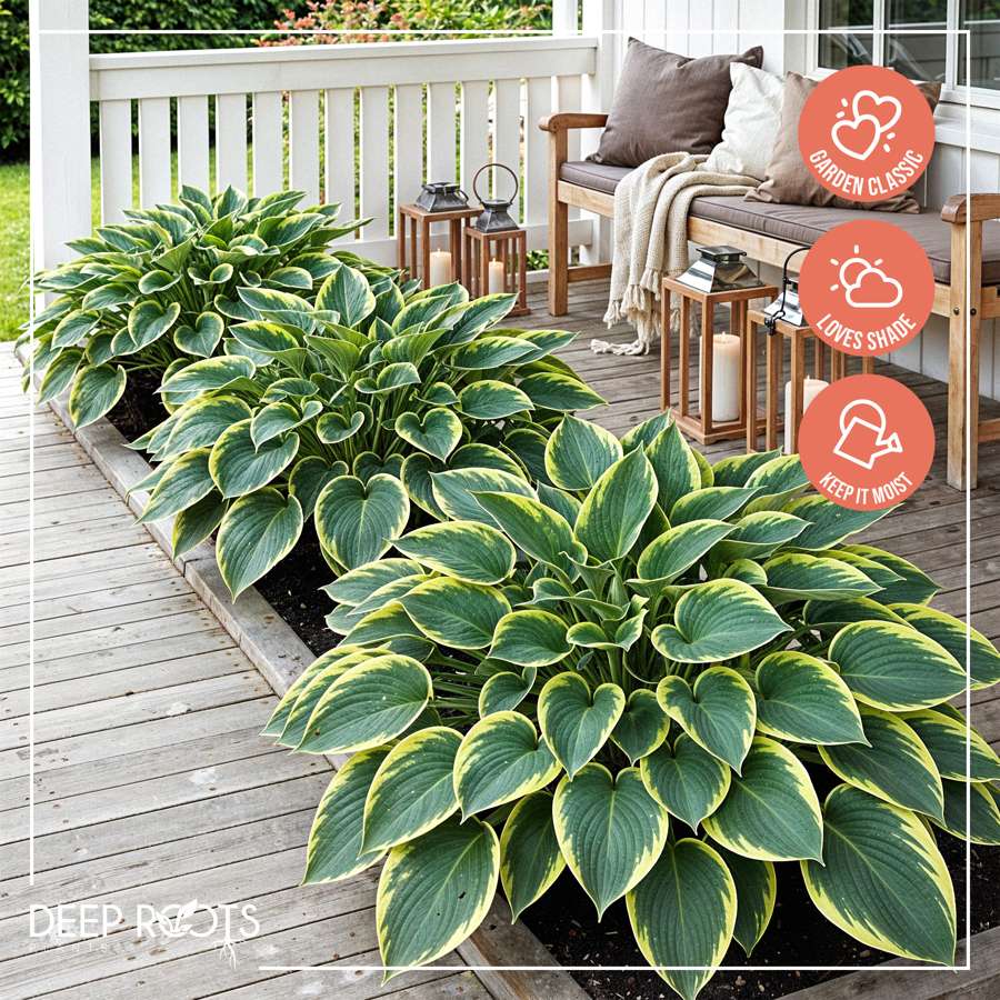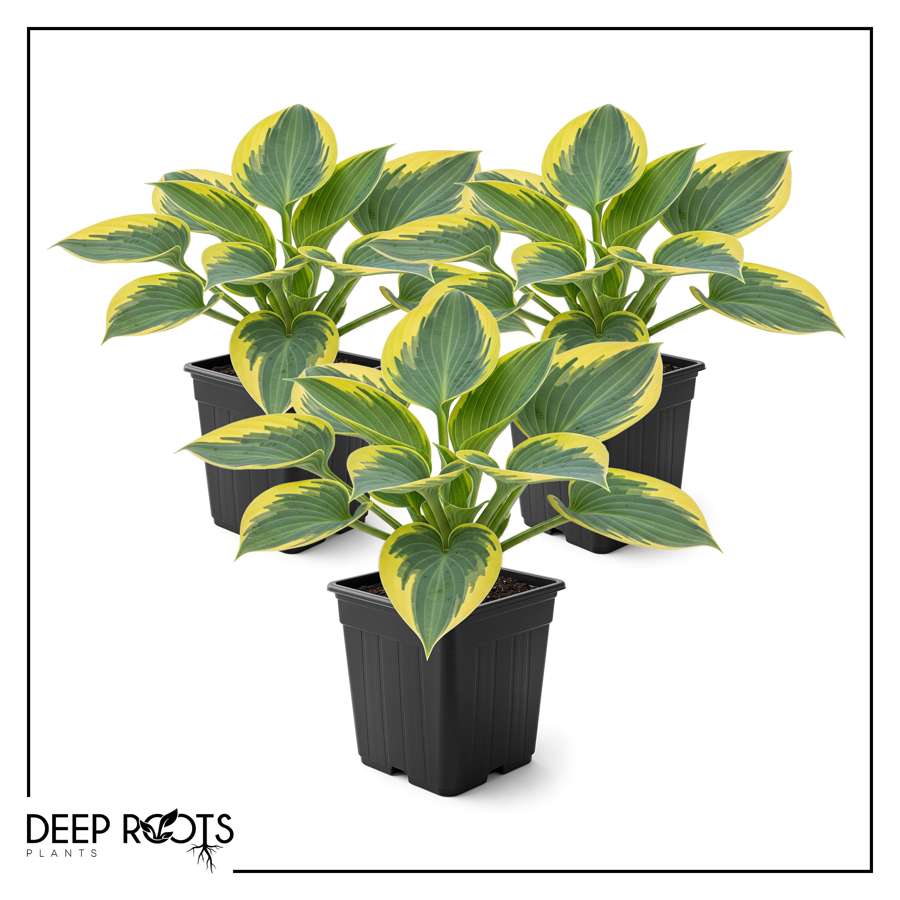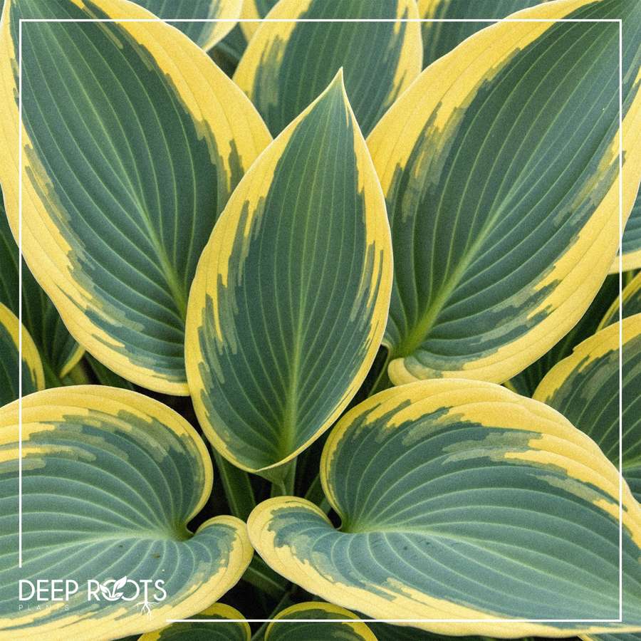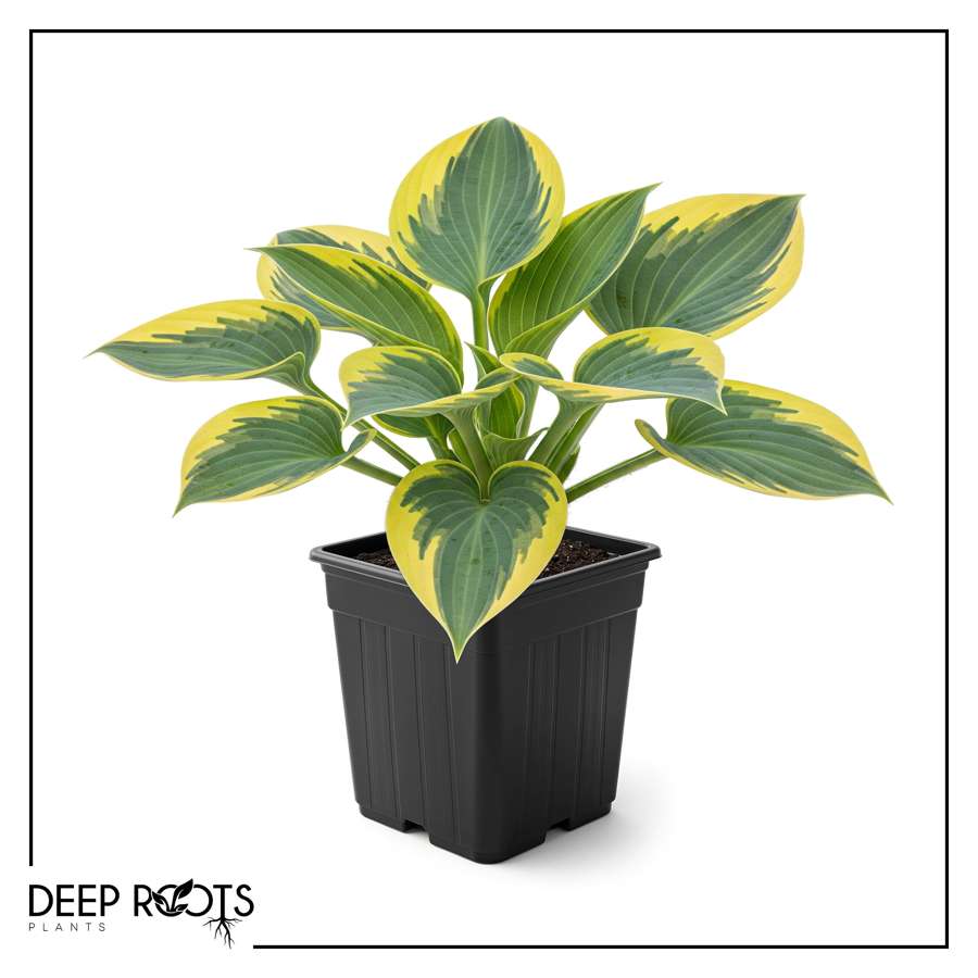 SHADE PLANTS: "First Frost" is known for its striking foliage and ability to maintain its beauty until the first frost. It's prized for its blue-green leaves with bright gold margins that fade to white as the season progresses. This hosta is relatively low-maintenance and is a great choice for adding color to shady garden areas.