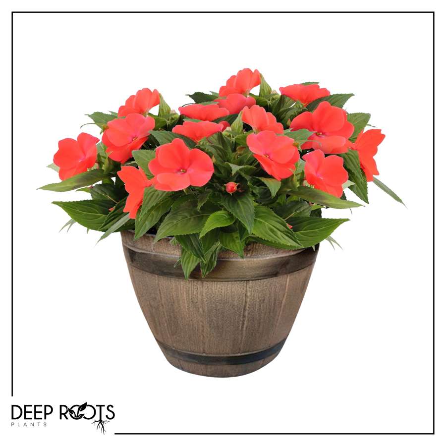 These lovely New Guinea Impatiens in a gorgeous whiskey barrel are a great addition to your Spring garden. Use them to line the walkway to your home or add some color around your garden with their beautiful heart-shaped petals. These plants are easy to care for so they are perfect for any beginners.