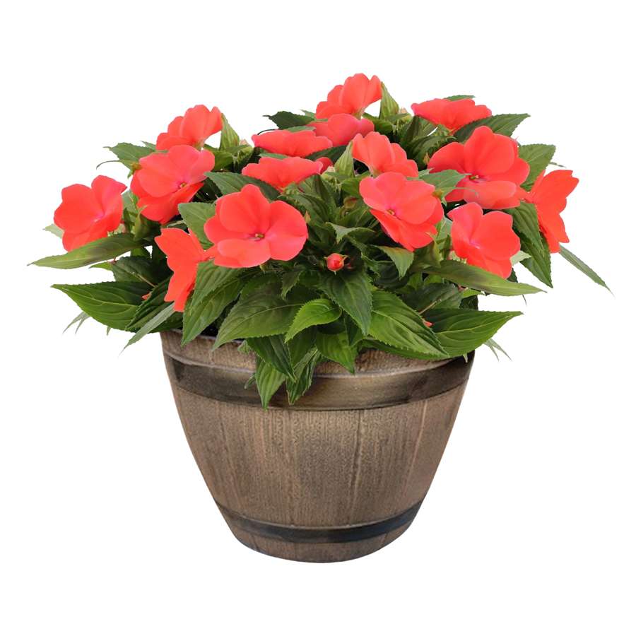 SPRING FLOWERS: These gorgeous New Guinea Impatiens in a whiskey barrel are perfect for beginners. They are low maintenance and their heart-shaped petals look beautiful in any space.