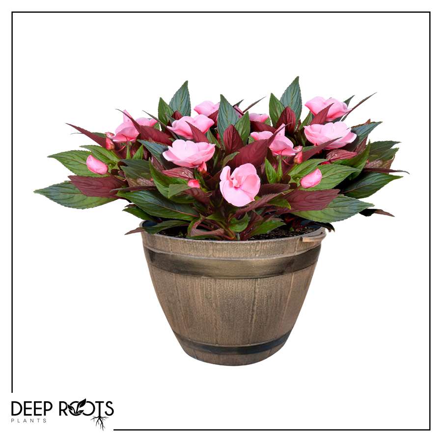 These lovely New Guinea Impatiens in a gorgeous whiskey barrel are a great addition to your Spring garden. Use them to line the walkway to your home or add some color around your garden with their beautiful heart-shaped petals. These plants are easy to care for so they are perfect for any beginners.
