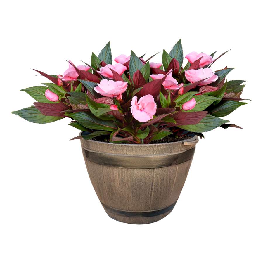 New Guinea Impatiens in Whiskey Barrel - Pink