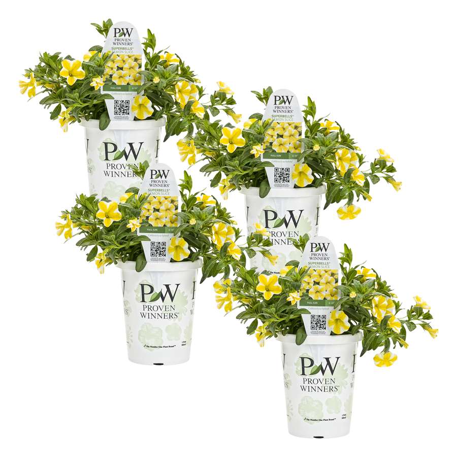 SPRING FLOWER: This beautiful Superbells Lemon Slice calibrachoa is definitely an attention grabber! It has bright yellow flowers with white accents that really stand out and make a beautiful pattern. They thrive in containers or raised beds!