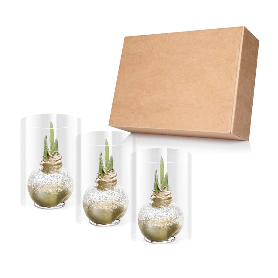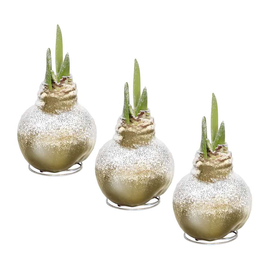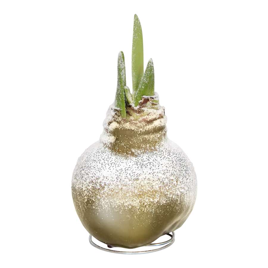 Nothing wows quite like a gold, snow flecked waxed amaryllis bulb. Place it on a flat surface and watch it bloom, adding the perfect touch to your space for the holiday season!