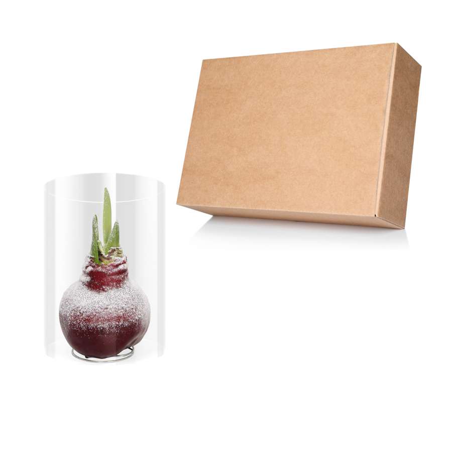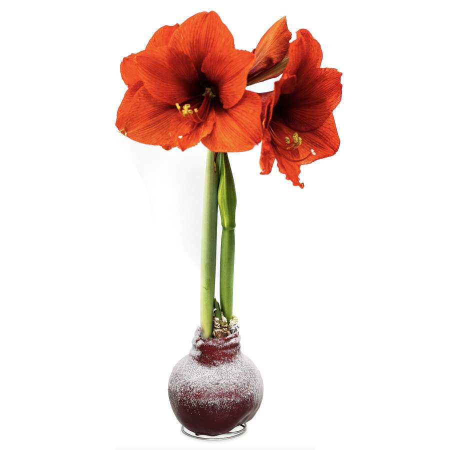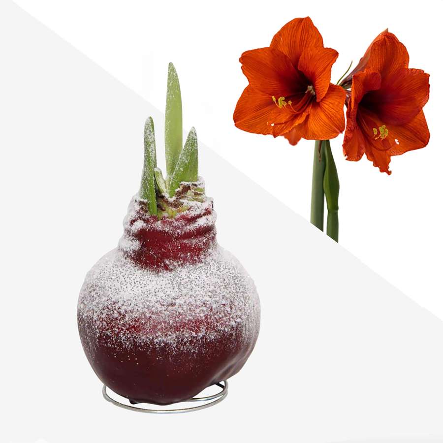 Nothing wows quite like a red, snow flecked waxed amaryllis bulb. Place it on a flat surface and watch it bloom, adding the perfect touch to your space for the holiday season!