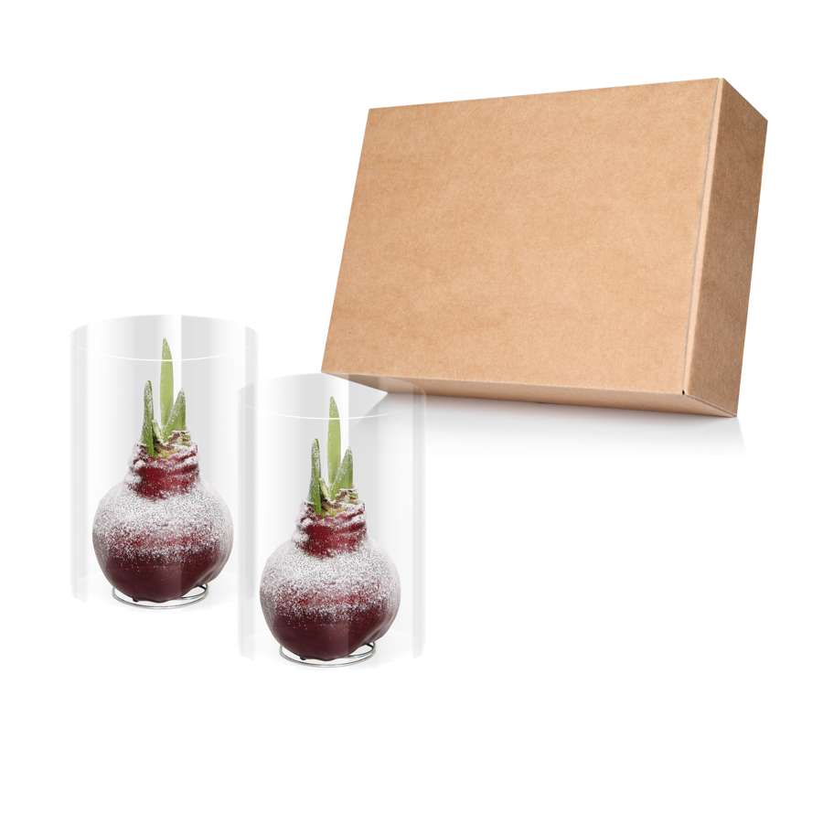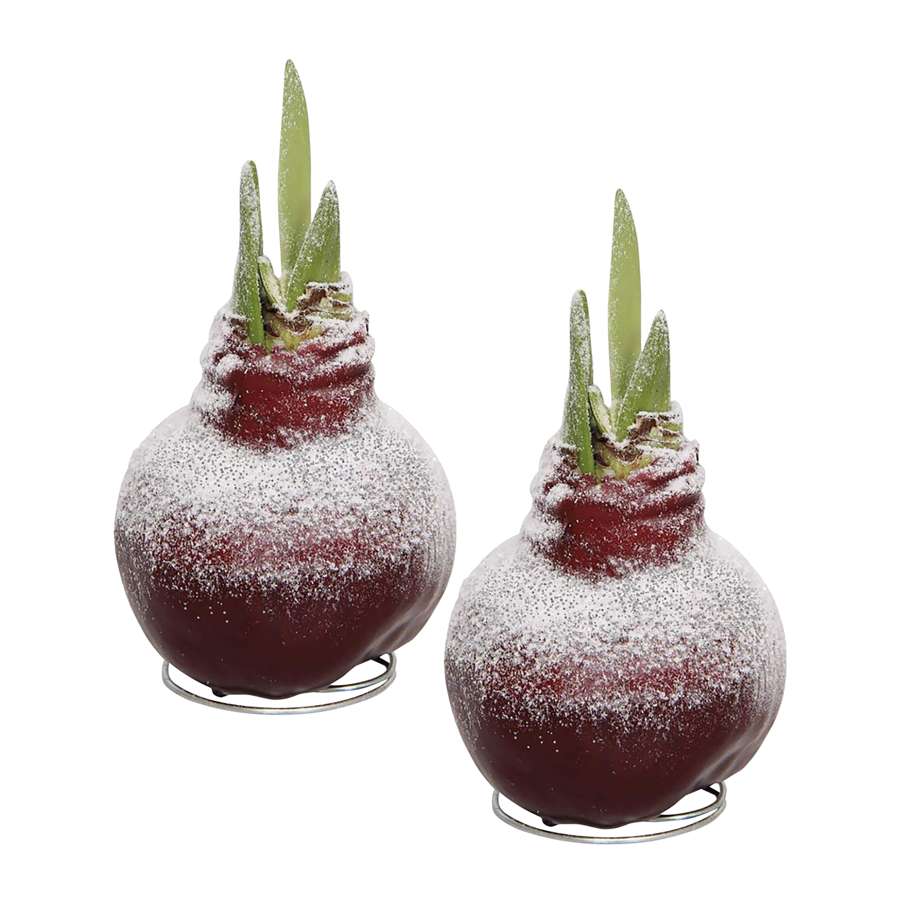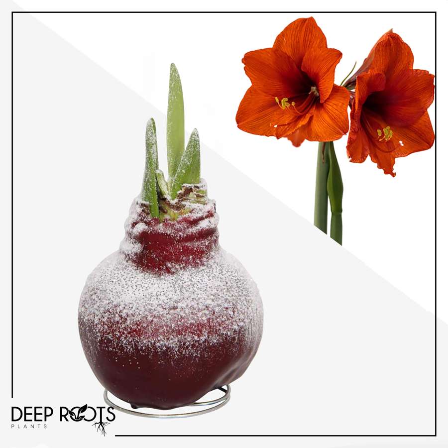 Nothing wows quite like a red, snow flecked waxed amaryllis bulb. Place it on a flat surface and watch it bloom, adding the perfect touch to your space for the holiday season!