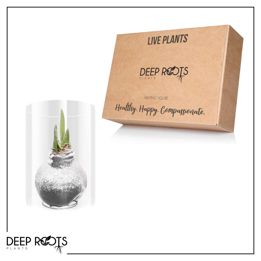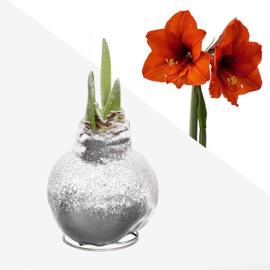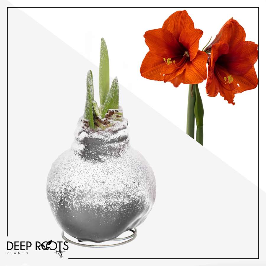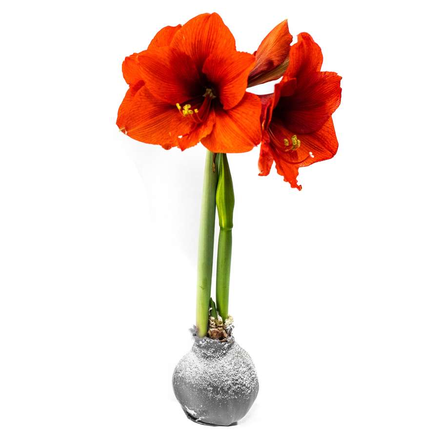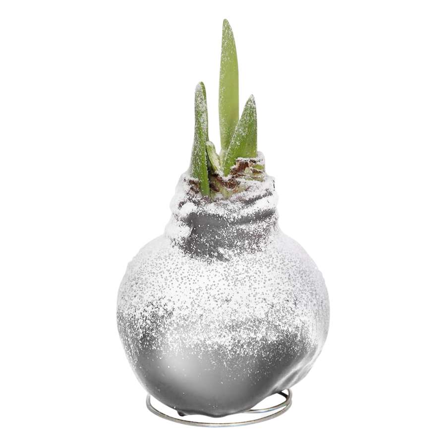 Nothing wows quite like a silver, snow flecked waxed amaryllis bulb. Place it on a flat surface and watch it bloom, adding the perfect touch to your space for the holiday season!