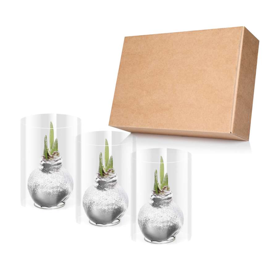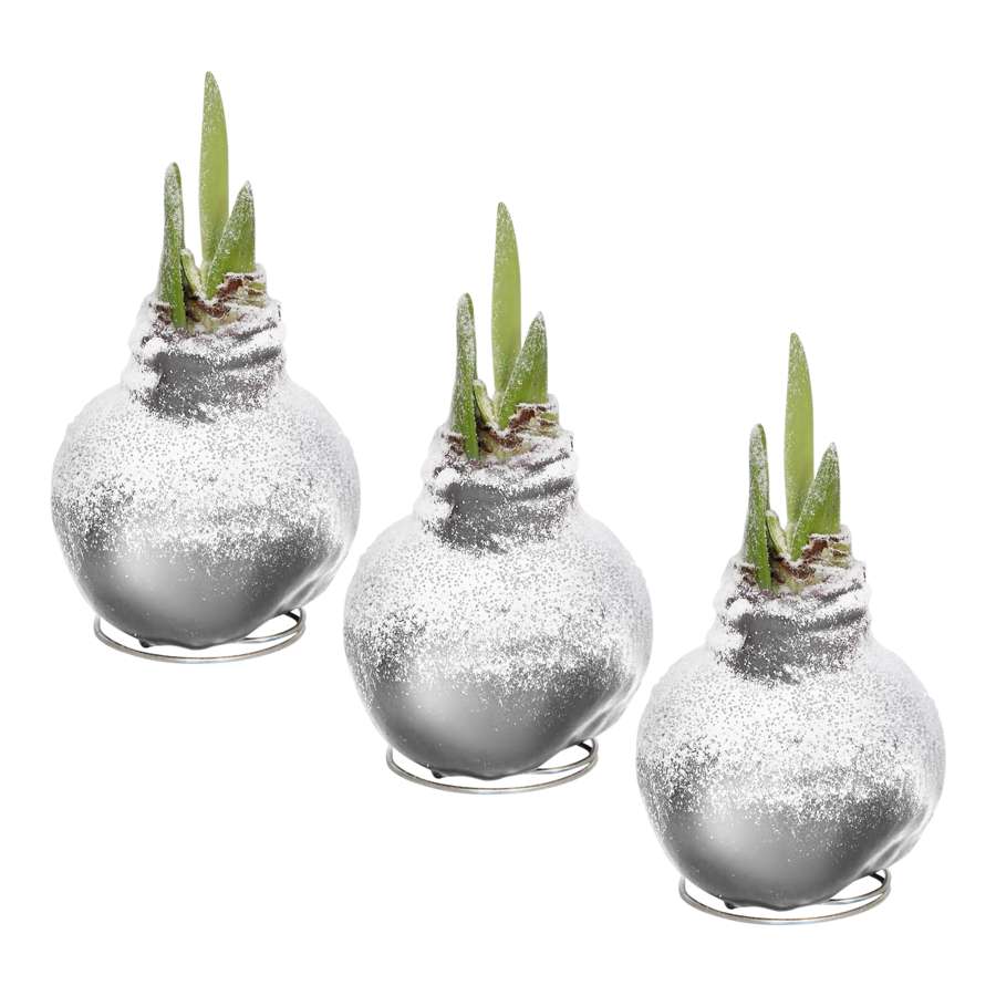 Nothing wows quite like a silver, snow flecked waxed amaryllis bulb. Place it on a flat surface and watch it bloom, adding the perfect touch to your space for the holiday season!